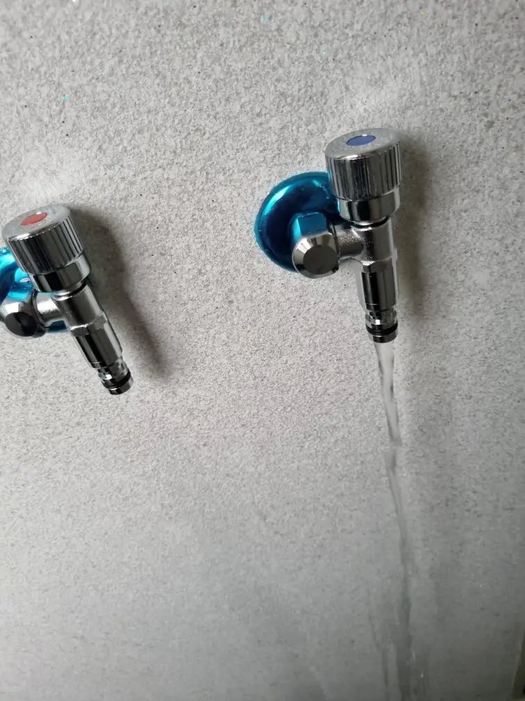 급수 밸브를 천천히 열어 물을 공급하기 시작했습니다. 벽부형 수도꼭지는 수압이 높을 수 있어 급하게 열면 문제가 생길 수 있습니다. 조금씩 열어가며 각 연결부의 누수를 확인했습니다.
