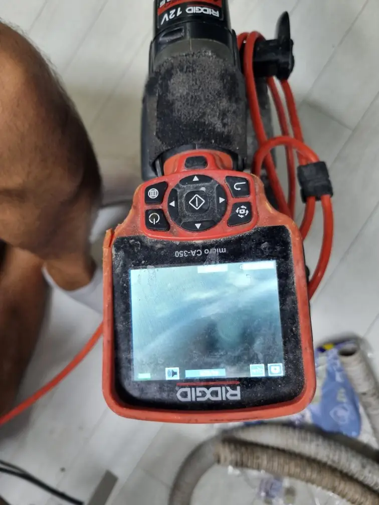 배수관 내부 상태를 정확히 파악하기 위해 내시경을 사용해 막힌 위치와 정도를 확인했습니다. 싱크대에서 약 2미터 지점에서 심각한 막힘이 발견되었습니다. 이물질이 배수관을 거의 완전히 막고 있어 물이 거의 흐르지 않는 상태였습니다.
