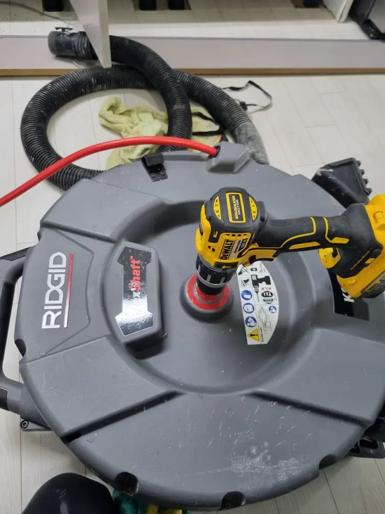 막힌 지점에서 샤프트를 회전시키기 시작했습니다. 샤프트의 강력한 회전력으로 굳어진 이물질을 조금씩 부수어 내기 시작했습니다. 이 과정에서 샤프트가 배수관 벽을 손상시키지 않도록 각도를 조절하며 신중하게 작업했습니다.